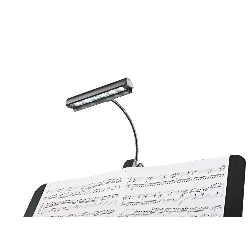 Lampička k notovému stojanu »Concert Light« se 6-ti extra jasnými, energeticky úspornými LED diodami. Možnost nastavení dvou úrovní jasu. Přesné nastavení kuželu světla díky sklu zabraňujícímu odleskům a flexibilnímu husímu krku. Praktický a extra široký klip zajišťuje snadné uchycení ke všem notovým pultům/stojanům o tloušťce 25 mm. Napájení pomocí 3 baterií AAA 1,5 V, nebo síťovým adaptérem (jsou součástí balení). Balení obsahuje také transportní obal. S magnetickým držákem 12256 lze lampičku použít jako samostatně stojící světlo. Vyrábí se v černé barvě.Cena a dostupnost